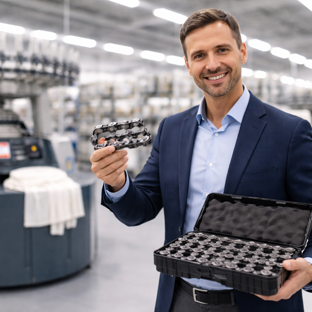 Repair of spare parts for textile machines (transport chains and stenter clips/needle plates, pinning and depinning systems such as shrinking units and brush stations, etc.)